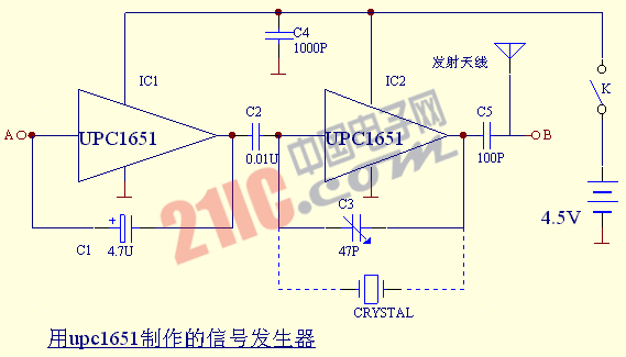 電路如圖所示,IC1,C1組成400HZ左右的低頻振蕩器;IC2、C3組成37MHZ左右的高頻振蕩 器;由C2輸出的低頻信號對高頻信號進(jìn)行調(diào)制。C4和天線構(gòu)成發(fā)射系統(tǒng)。高頻振蕩器的 諧波可在電視機(jī)三頻道接收(或其它頻道)顯示出黑白相間的條格信號。A點(diǎn)、B點(diǎn)輸出 信號,分別作低頻及圖像通道的檢測信號源。 把C3換成石英晶體可使振蕩頻率穩(wěn)定,如圖虛線部分所示。若把接C3處使用一副接 線柱或插座,把C3分別換成晶體;頻率選為465KHZ、10.7KHZ、6.5KHZ、4.43MHZ、37MHZ 就可以做收錄機(jī)、電視機(jī)的中頻信號源。