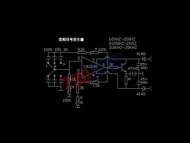輸出頻率:20HZ-20KHZ。輸出幅度:2V。制作簡單,性能優(yōu)良,完全滿足DIY音響需要。電路原理:由CA3140運算放大器擔綱主放大器,由100K電位器和移相電容組成移相,正反饋,選頻網(wǎng)絡(luò)。1K電位器,熱敏電阻構(gòu)成負反饋穩(wěn)幅電路。音頻信號經(jīng)跟隨器輸出。