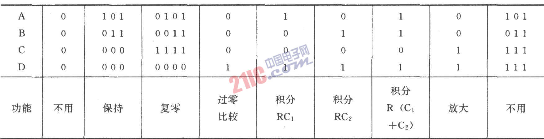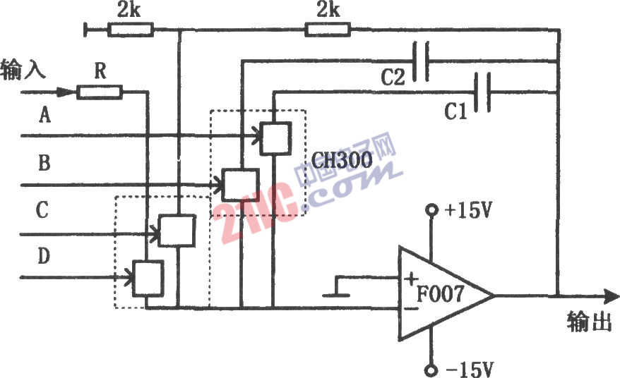 如圖所示為可控積分電路。該電路具有復(fù)零、保持和不同積分時間常數(shù)的可控積分器。其中模擬開關(guān)為CH300,運(yùn)算放大器為F007。圖中的R和C1、C2數(shù)值可按需要配置。4個模擬開關(guān)不同的控制狀態(tài)使電路完成不同的功能。控制端A、B、C、D的狀態(tài)與功能的關(guān)系如表所示。