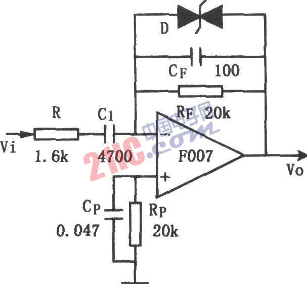 如圖所示為低噪聲微分電路。該電路是在基本微分器基礎(chǔ)上增加少量元件,從而具有過載保護能力,穩(wěn)定性好且噪聲低。R的接入能使電路穩(wěn)定,并起減小噪聲和增大輸入阻抗的作用。在微分器工作頻率不高時,為了更好的抑制高頻噪聲,加了電容Cp。穩(wěn)壓管D是考慮有可能突然出現(xiàn)很大的單極噪聲而設(shè)置。Cp是用于將Rp上的熱噪聲旁路,并能保持回路穩(wěn)定。