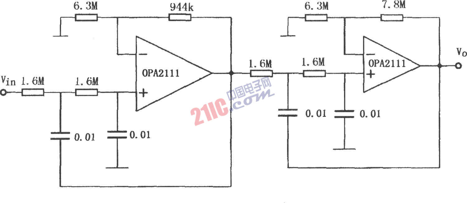 如圖所示為10Hz四階巴特沃斯低通濾波電路。該電路利用OPA2111雙運(yùn)放的高阻抗、低偏置電流的特點(diǎn)組成四階有源濾波器。按圖示元件參數(shù),電路的截止頻率為10Hz,增益為2.6,斜率為-24dB/倍頻程。為降低熱噪聲,一般選用比較低的電阻值,但相應(yīng)電容容量增大了。