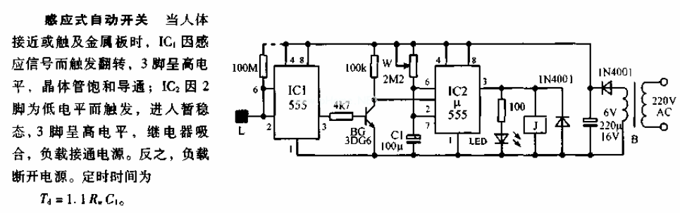 這是一個(gè)用4013組成的觸摸開關(guān)電路,只要用手觸摸一次開關(guān)即可接通,再觸摸一次開關(guān)斷開。由于CMOS電路的輸入端均為場效應(yīng)管結(jié)構(gòu),而場效應(yīng)管是一種電壓控制元件,它有極高的輸入阻抗,約幾十兆歐。它