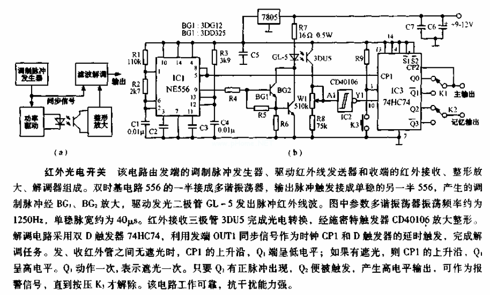 關(guān)鍵字: 電源開關(guān) 光電 遙控 開關(guān)電路圖工作原理如圖1所示。它是一個(gè)光控?cái)嚯娺b控裝置,可以用于電簡(jiǎn)的光線進(jìn)行觸發(fā)。電路由兩部分組成:一部分是光控電路;另一部分是受控電路。其中光控部分由光電三極管VT1、電位器RP相三極管VT2組成。