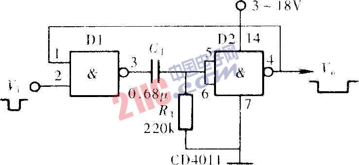 用CMOS與非門或者或非門都可以組成單穩(wěn)態(tài)觸發(fā)器,這種單穩(wěn)態(tài)觸發(fā)器在電路中廣泛地用于對(duì)脈沖信號(hào)的延時(shí)、展寬和整形等。用門電路組成的單穩(wěn)態(tài)觸發(fā)器,它的主要原理是利用門電路輸入端的閾值電平和加入門電路中的RC元件的充放電作用。用與非門或者邏輯門都可以組成單穩(wěn)態(tài)觸發(fā)器,但它們各自的觸發(fā)方式不同,輸出的邏輯電平也不同。如圖所示為用門電路組成的單穩(wěn)態(tài)觸發(fā)器電路。