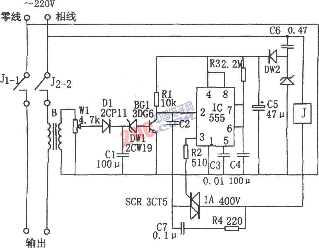 當(dāng)用電超過負荷時,穩(wěn)壓管DW1擊穿,BG1飽和導(dǎo)通,555因②腳電位為低電平而發(fā)生置位,③腳輸出的高電平使可控硅SCR導(dǎo)通,繼電器J吸合,觸點J1-1、J2-2斷開,切斷~220V電源。待4分鐘后,555輸出低電平,相應(yīng)J釋放.觸點J1-1、J2-2閉合,電源接通,再進行檢測。