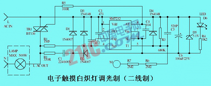 電路主要采用專門芯片SM7232制作而成,它通過人體觸摸M點觸摸片,控制白熾燈的開關和調(diào)光,最大負載功率達500W。