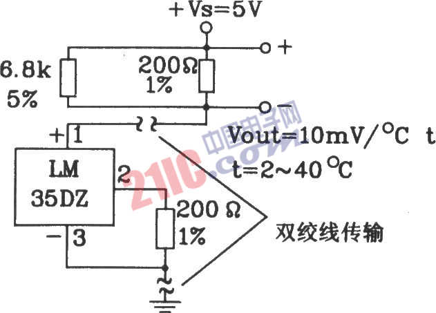 LM35DZ攝氏溫度傳感器構(gòu)成共地遠距離傳輸電路圖: