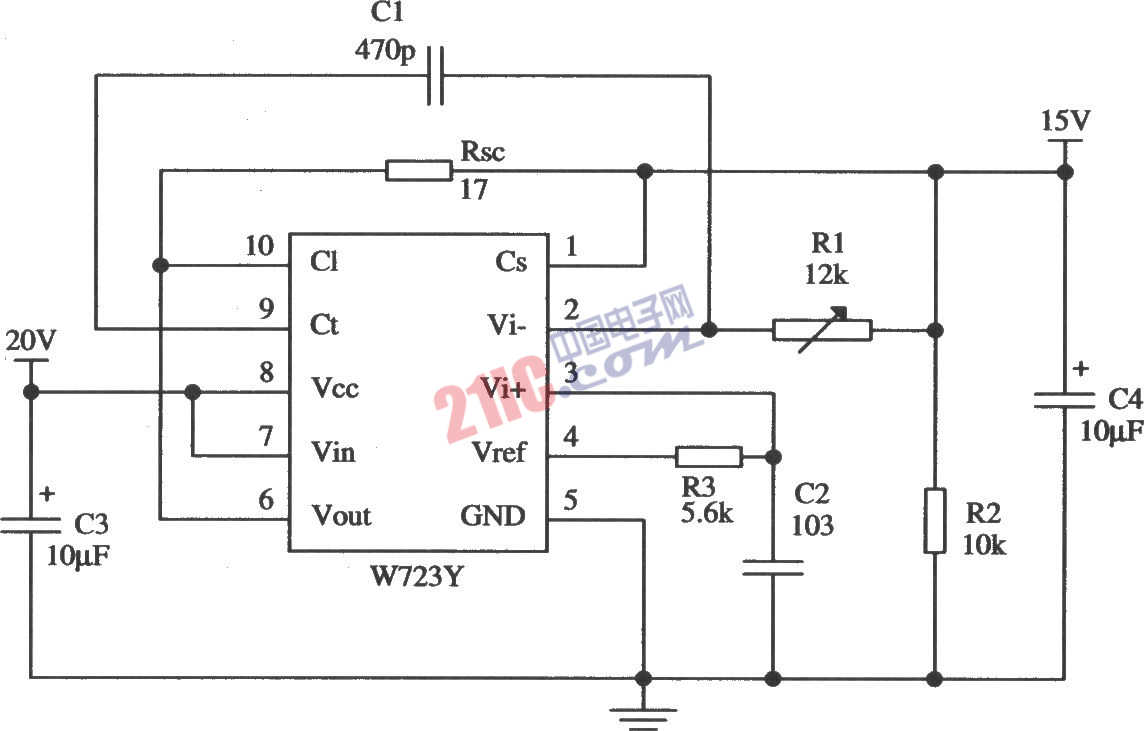 如圖所示是用W723多端可調式正集成穩(wěn)壓器組成的輸出電壓比基準電壓高的應用電路。其中采用了限流保護,輸出電壓為7~36 V可調。圖中輸入電壓為20 V,輸出電壓為l5 V。圖示電路同樣是通過改變取樣電阻的分壓比來改變輸出電壓。R2的計算方法如下: