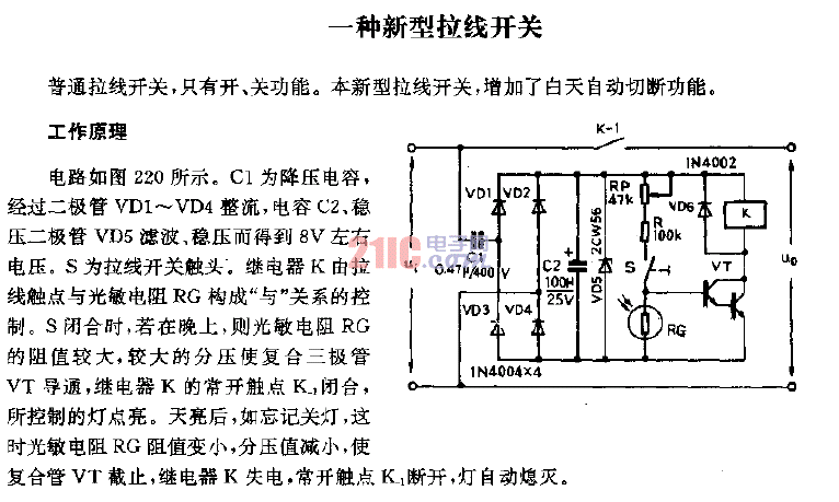自配半導體穩(wěn)壓電源的臺式半導體收音機,使用者往往在關(guān)閉音量的開關(guān)后忘記撥下220V電源插頭,造成穩(wěn)壓長期耗電乃至燒毀。這里介紹的電路,只須增設(shè)一只開關(guān)K1作為交直流切