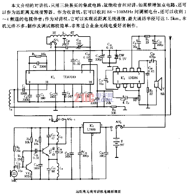 本機由3塊低壓集成電路構(gòu)成。它具有電路簡單、制作容易、體積小巧、攜帶方便、工作電壓低等特點,其工作頻率在88~108MHz頻段。本機的工作電流極小,其發(fā)射狀態(tài)的靜態(tài)電流約為7mA,工作頻率為105MHz左右,接收狀態(tài)的