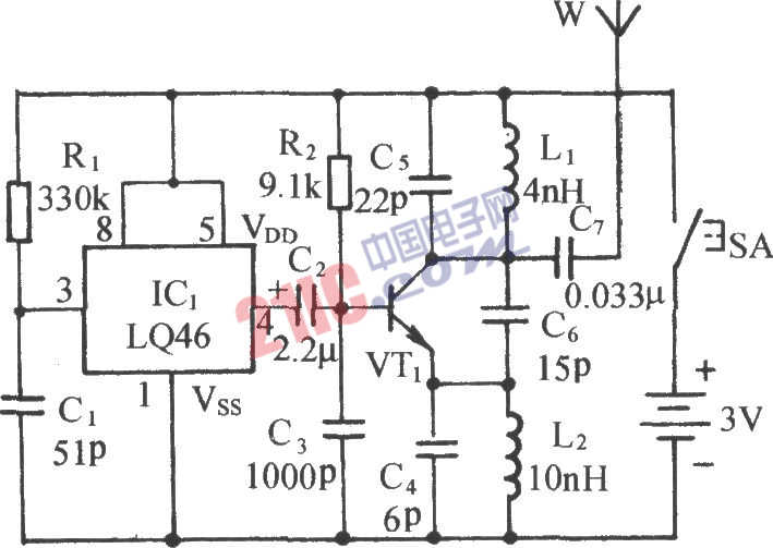 電路如圖所示。它由語言發(fā)聲電路和調(diào)頻發(fā)射電路等組成。它的電路簡(jiǎn)單、容易制作。它與一臺(tái)普通的調(diào)頻(FM)收音機(jī)相配合,可對(duì)現(xiàn)場(chǎng)發(fā)生的情況進(jìn)行監(jiān)聽,以采取防范措施。