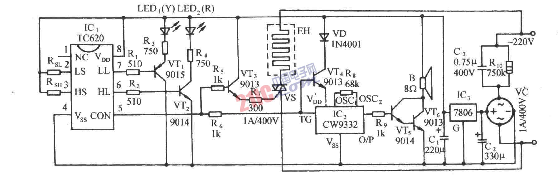 TC620溫度傳感自動加熱恒溫控制電路圖 時間:2008-10-10 23:31:06 關鍵字: 溫度傳感 自動加熱 控制電路圖 恒溫控制電路 手機看文章掃描二維碼隨時隨地手機看文章 [導讀]電路如圖所示。它包括TC620溫控電路,溫度指示電路、可控硅控制加熱電路、樂曲發(fā)聲電路和交流降壓整流電路等。 function resizeImage(evt,obj){ newX=evt.x; newY=evt.y; obj.width=newX; obj.height=newY; 電路如圖所示。它包括TC620溫控電路,溫度指示電路、可控硅控制加熱電路、樂曲發(fā)聲電路和交流降壓整流電路等。 欲知詳情,請下載word文檔 下載文檔 作者:miracle