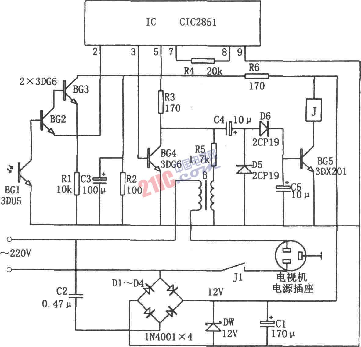 當(dāng)手持遙控器向電視機(jī)發(fā)出信號時(shí),電路中的光敏三極管BG1收到此信號。該信號為脈沖調(diào)制信號,其平?β市?。凑b藕啪?G2管放大后觸發(fā)IC,使其發(fā)出音頻信號,該音頻信號經(jīng)D5和D6倍壓整流后產(chǎn)生偏流,使BG5導(dǎo)通、繼電器J吸合,從而使電視機(jī)電源接通。交流電流通過變壓器B的次級后產(chǎn)生的交流電壓代替了IC的音頻信號,又使繼電器J產(chǎn)生自鎖。