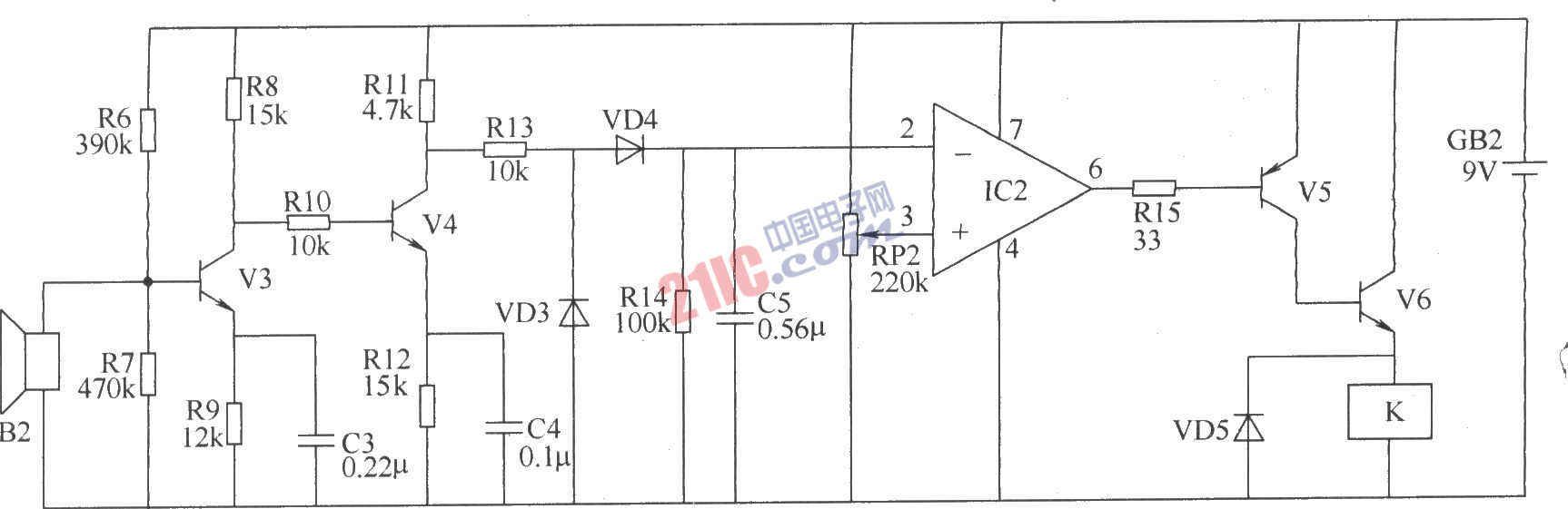超聲波發(fā)射器電路 超聲波接收器電路由超聲波接收頭B2、晶體管V3~V5、運算放大器集成電路IC2、繼電器K、二極管VD3~VD5和電阻器R6~R15、電容器C3~C5、電位器RP2等組成,如圖所示。