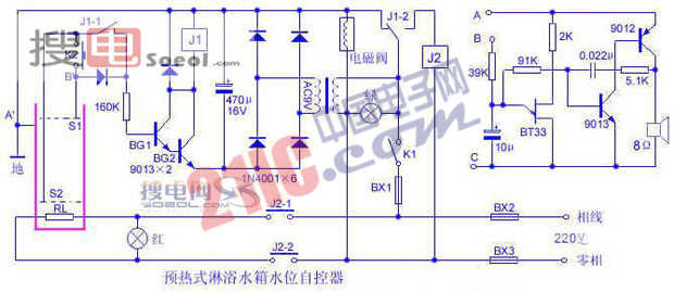 工作原理:假設(shè)水箱內(nèi)沒有水,需要進(jìn)水預(yù)熱,只要將K1合上(見下圖),則綠色指示燈亮,電磁閥經(jīng)J1-2常閉觸點(diǎn)得電而開閥進(jìn)水,待水箱內(nèi)水升至平面S1時(shí),BG1、BG2組成的復(fù)合管得正向偏壓而驅(qū)動(dòng)繼電器J1動(dòng)作將J1-1吸合,同時(shí)J1-2動(dòng)作,電磁閥斷電關(guān)水,交流接觸器J2得電吸合,電熱管R1對(duì)水加熱,紅色指示燈亮。沐浴過程中,水位不斷下降,待水位低于平面S2時(shí),復(fù)合管失正向偏壓使J1釋放,電磁閥又得電開閥進(jìn)水,電熱管失電得到保護(hù),紅色指示燈滅。