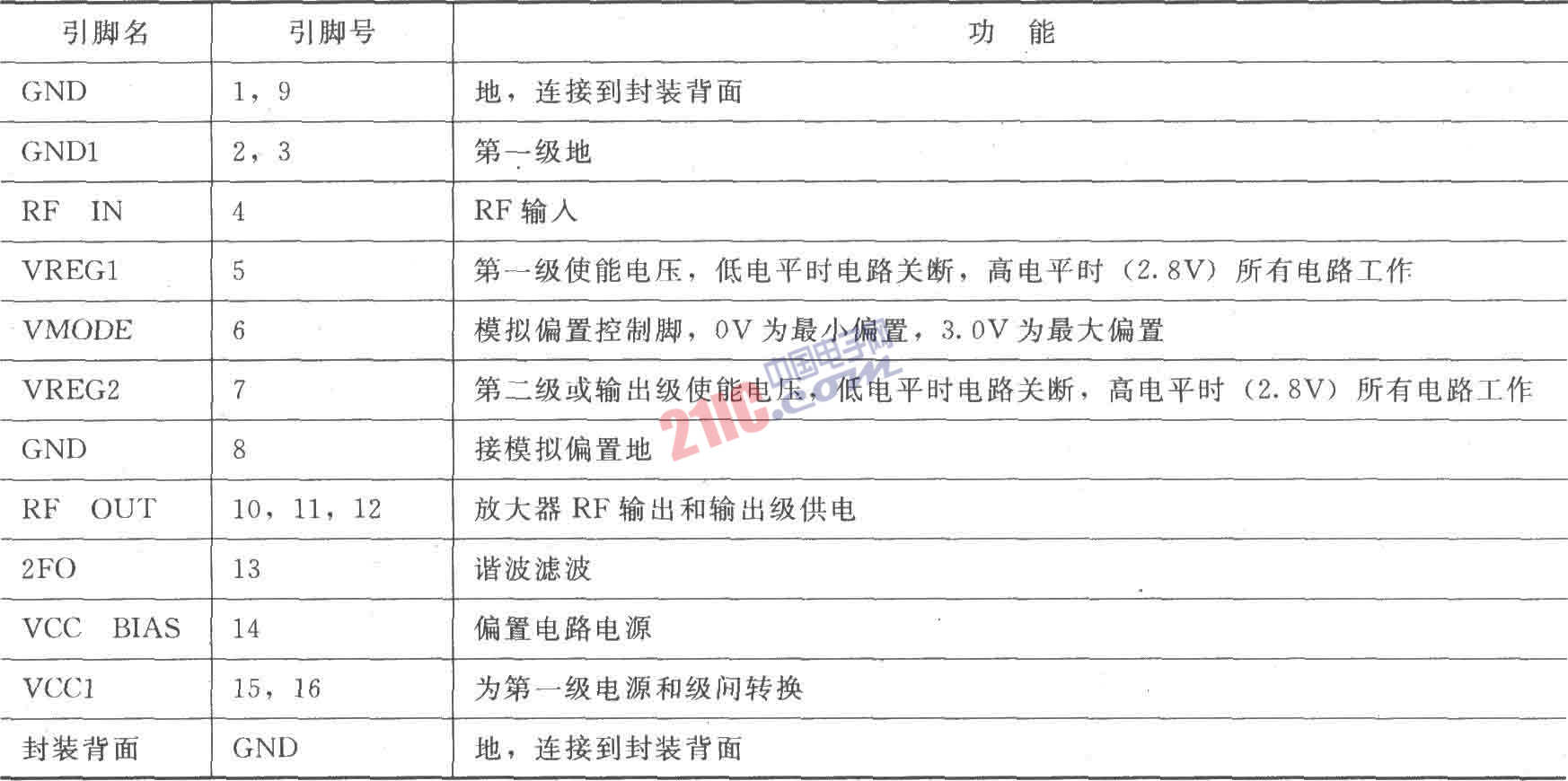 RF2162是大功率、高效率線性放大器IC,應(yīng)用在3V手持式系統(tǒng),采用先進的砷化鎵異質(zhì)結(jié)雙極型晶體管(HBT)處理,設(shè)計用于雙模式3V CDMA/AMPS手持數(shù)字式蜂窩系統(tǒng)設(shè)備的末級線性RF放大、擴頻系統(tǒng)和其他工作頻率為800~960MHz的應(yīng)用。RF2162有一個模擬偏置控制電壓去產(chǎn)生最大效率,器件本身包含50Ω輸入和輸出,很容易匹配以獲得最佳的功率、效率和線性特性。RF2162采用緊湊的16腳無引線封裝,其引腳排列如圖所示。