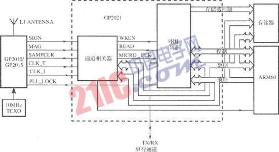 GP2021是一個(gè)12信道的C/A碼基帶相關(guān)器,在NAVSTAR GPS衛(wèi)星導(dǎo)航接收機(jī)中應(yīng)用。可以與GP2015和GP2010 C/A碼射頻下變頻器組合使用。GP2021可以與大多數(shù)的16 bit和32 bit微處理器組合使用,尤其適合Motorola和Intel的微處理器。另外,片上支持ARM60 32 bit RISC微處理器。當(dāng)使用ARM60 32 bit RISC微處理器時(shí),片上的存儲(chǔ)器支持所有的GPS接收機(jī)功能。在不需要12個(gè)通道工作時(shí),GP2021允許12個(gè)通道中的任一個(gè)不工作,以降低功耗和減少微處理器的負(fù)載。在備用電池模式,GP2021允許所有的功能不使能,僅32.768kHz振蕩器和實(shí)時(shí)時(shí)鐘(Real Time Clock,RTC)維持工作。GP2021具有12個(gè)獨(dú)立的相關(guān)器信道,雙UART和RTC,電源電壓5V,功耗小于150mW,備用電池電壓2.2V。采用80L MQFP封裝,封裝尺寸14mm×14mm×2.0mm,適合GPS導(dǎo)航接收機(jī)、GPS測(cè)量接收機(jī)、GPS時(shí)間傳遞接收機(jī)等應(yīng)用。 典型GPS接收機(jī)電路如圖所示,電路由GP2010或者GP2015射頻前端、GP2021相關(guān)器和ARM60 32 bit RISC微處理器組成。因?yàn)樗械男l(wèi)星使用相同的頻率,即Ll(1575.42MHz),因此可以使用一個(gè)射頻前端。為了達(dá)到更好的天空覆蓋效果,它可以使用不止一個(gè)的天線,因此需要使用各自的射頻前端。在射頻部分,GP2010或者GP2015射頻前端為數(shù)字基帶處理完成L1信號(hào)的下變頻。獲得的信號(hào)在GP2021中與內(nèi)部產(chǎn)生的衛(wèi)星代碼相關(guān)。每一個(gè)通道有自己?jiǎn)为?dú)的代碼,可以同時(shí)對(duì)12個(gè)不同衛(wèi)星信號(hào)進(jìn)行截獲和跟蹤。相關(guān)的結(jié)果形成累積數(shù)據(jù)傳輸?shù)轿⑻幚砥鬟M(jìn)行處理,得到導(dǎo)航信息。
