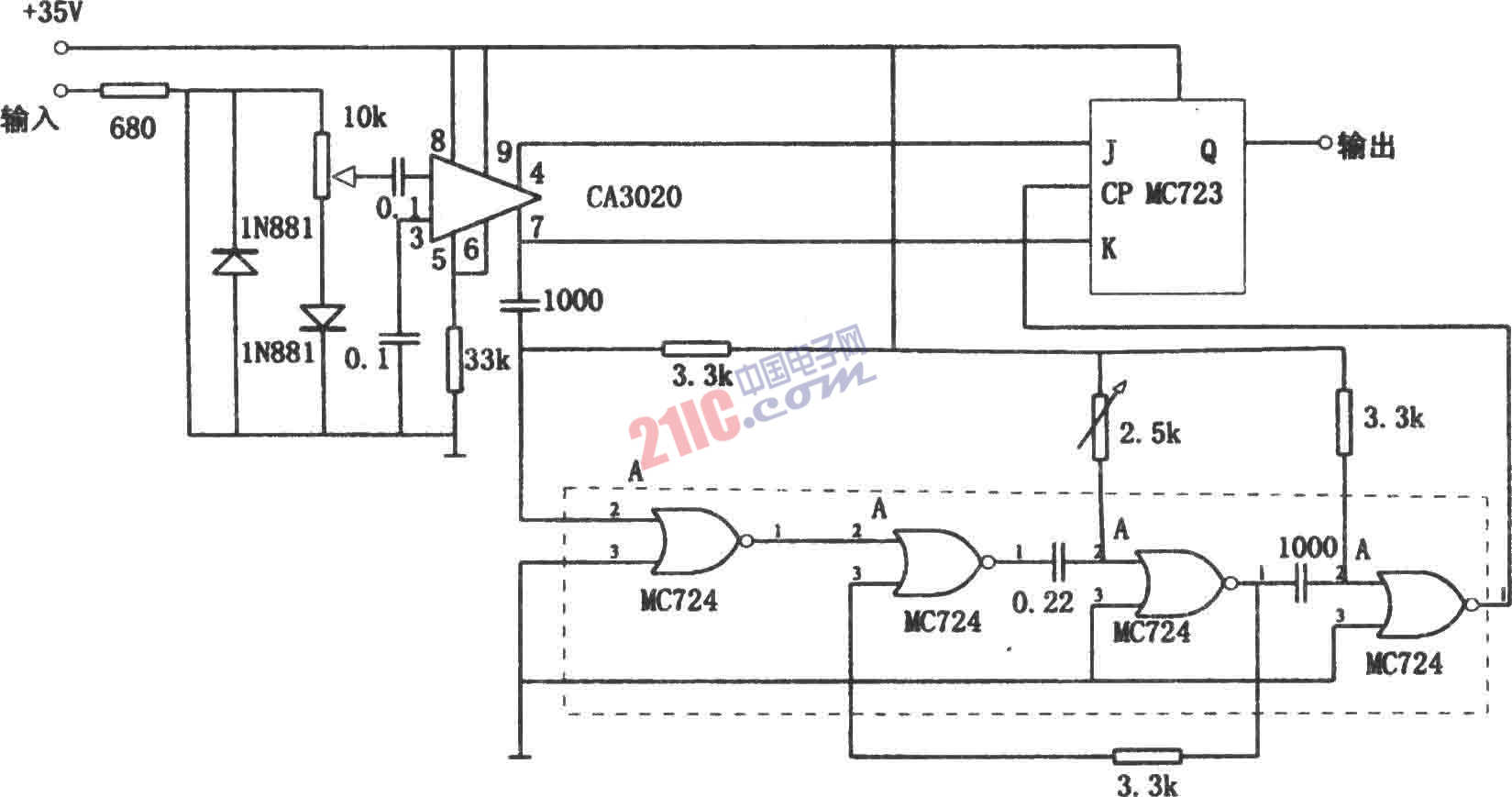 如圖所示為數(shù)字式頻移解調(diào)電路。該電路可以適用在1kHz到10kHz的頻率范圍,并能解調(diào)到1%的頻偏。電路的輸入級(jí)由寬頻帶放大器CA3020構(gòu)成。它的差分輸出加到J-K觸發(fā)器的J-K輸入端。門(mén)電路MC724構(gòu)成單穩(wěn)態(tài)多諧振蕩器。單穩(wěn)態(tài)多諧振蕩器的定時(shí)周期等于中心頻率的半個(gè)周期。輸入信號(hào)經(jīng)單穩(wěn)態(tài)多諧振蕩器延時(shí)后選通觸發(fā)器。例如,以2920Hz表示符號(hào),2750Hz表示空格,則中心頻率為2835Hz,因此單穩(wěn)態(tài)多諧振蕩器的定時(shí)周期為175μs。當(dāng)輸入為2920Hz時(shí),觸發(fā)器選通正好J=1,K=0,故Q輸出為“1”(表示符號(hào));當(dāng)輸入為2750Hz時(shí),觸發(fā)器選通正好是J=0,K=1,故Q輸出為“0”(表示空格)。該電路鑒別精度主要取決于單穩(wěn)態(tài)多諧振蕩器的定時(shí)精度。