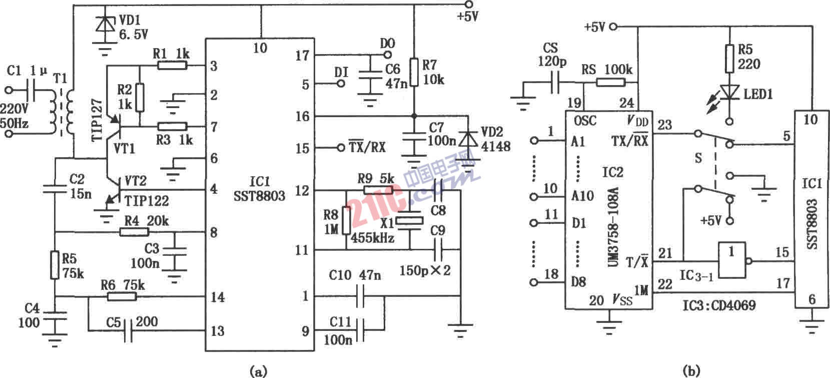 圖(b)為紅外無(wú)線耳機(jī)的接收電路。紅外接收管VD3~VD5接收到發(fā)射電路發(fā)出的紅外線信號(hào)后,將其轉(zhuǎn)換為音頻信號(hào),再由三極管VT2放大送入集成運(yùn)放ICl作功率放大,最后由耳機(jī)BE輸出。電路中使用3只紅外接收管是為了能全方位接收信號(hào)。調(diào)試時(shí),先用手觸摸紅外接收管的正極,調(diào)節(jié)電阻R4、R5使耳機(jī)BE輸出的交流聲最響,然后再接通發(fā)射電路,適當(dāng)調(diào)節(jié)電視機(jī)或收錄機(jī)的音量大小,直到耳機(jī)傳出的聲音大且清晰為止。