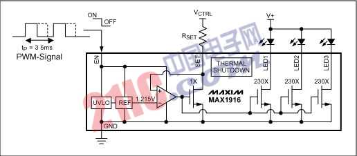 圖9:單個(gè)外部電阻(RSET)設(shè)定流經(jīng)每個(gè)LED的電流數(shù)值,在IC的使能引腳(EN)上加載脈寬調(diào)制信號(hào)可以實(shí)現(xiàn)簡單的亮度控制(調(diào)光功能)。