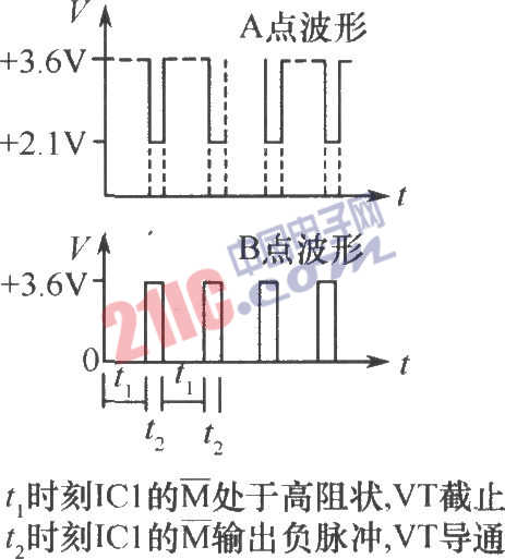 如圖所示為照明節(jié)電控制電路。IC1采用石英鐘集成控制電路,由于石英鐘的工作電壓只有1.5V,其輸出難以滿足驅(qū)動指針步進電機所需的脈沖信號。因此,用VD1、VD2、C3將IC1地電位抬高至+2.1V,使IC1正常工作在1.5V狀態(tài)。IC1輸出的步進脈沖信號從A通過 VT、R1、R2組成的反相緩沖器整形,從B點輸出滿足后面數(shù)字集成電路的秒脈沖方波信號,其A、B點的輸出波形見下圖。