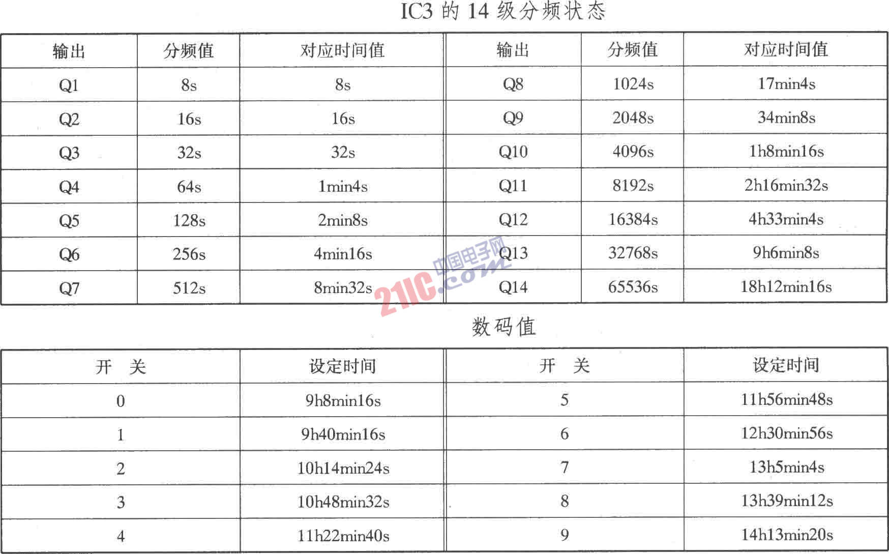 在t1時刻IC1的M處于高阻狀態(tài),VT截止;t2時刻IC1的M輸出負脈沖,VT導通,從VT集電極輸出合格的CLK1時鐘信號。IC2為雙D觸發(fā)器,將反相輸出端反饋到數(shù)據(jù)輸人端D連接成2分頻器,IC2-A的數(shù)據(jù)輸出端Q1與IC2-B的時鐘輸入端CLK2相連,組成4分頻器,其4分頻信號再送入IC3進行14級分頻,這樣就將秒信號進行了18級分頻,其IC3的14級分頻狀態(tài)下表。從IC3的Q5、Q6、Q10、Q12、Q14數(shù)據(jù)輸出端取出128s、256s、4096s、16384s、65536s的分頻信號,通過VD3~VD7、R3、R4以及啟動按鈕AN組成的與門電路相加得到86400s即24h的計時復位信號,并通過R4送入到IC3復位輸入端R(11腳),當5個輸出端全部為高電平時,通過VD3~VD7相加得到86400s即24h計時值,這時IC3復位,輸出端全部為零,使計時時間為24h自動循環(huán)。這樣IC1~IC3、VD1~VD7與外圍元件VT、R1~R4、C1~C3等組成24h循環(huán)計時電路。R4的作用是避免按下AN時損壞與VD3~VD7連接的IC3數(shù)據(jù)門。由于時鐘由石英表集成電路產(chǎn)生,因此日計時誤差在3s以內(nèi),完全符合鐘控計時照明節(jié)電器的要求,時鐘電路不需任何調(diào)試即可工作。IC4、IC5兩個4位數(shù)值比較器級聯(lián)組成8位數(shù)值比較器,IC4的級聯(lián)輸入端A、A0、A1接高電位,A2、A3接IC3,IC5的數(shù)據(jù)A輸入端接IC3的Q11~Q14分頻輸出端, 即從24h循環(huán)計時電路中取出2048s(34min8s)~85488s(23h51min28s)間隔為2048s的64級6位定時數(shù)據(jù)作為輸入數(shù)據(jù)A,IC4的A0、A1、B0、B1接高電平,從BCD撥碼開關(guān)取4位BCD數(shù)據(jù)送到IC4的數(shù)據(jù)輸入端B2、B3和IC5的B0、B1端,作為IC4、IC5數(shù)據(jù)B中的4位數(shù)據(jù),IC5的B2端接高電位,83端接低電位。這樣可通過BCD撥碼開關(guān)設(shè)定10個定時 數(shù)據(jù)中的一個與定時時鐘送來的時鐘數(shù)據(jù)(具體數(shù)碼值見表)相比較。