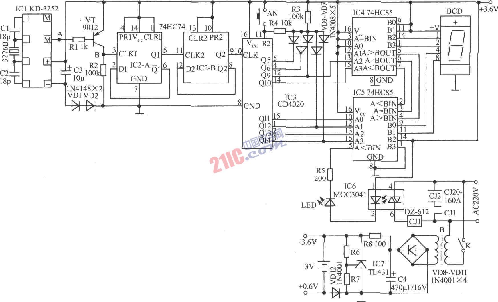 當定時數(shù)據(jù)A小于BCD撥碼開關(guān)設(shè)定時間數(shù)據(jù)B時,IC5的5腳輸出低電平,IC6得電觸發(fā)導通,繼電器CJ1、CJ2吸合照明燈亮。反之,數(shù)據(jù)A大于數(shù)據(jù)B時,IC5的5腳輸出高電平,IC6無觸發(fā)電壓關(guān)斷,CJ1、CJ2釋放,照明燈熄滅。IC4、IC5的輸人數(shù)據(jù)即Q9~Q14從零秒計時到大于BCD撥碼開關(guān)設(shè)定的時間數(shù)據(jù)應(yīng)為夜間亮燈時間,數(shù)據(jù)A大于BCD設(shè)定的時間數(shù)據(jù)B一直到24h循環(huán)復位時為止這段時間為白天的熄燈時間。因而應(yīng)將24h循環(huán)定時電路的起始點放在天黑需要點亮照明燈的時候,而不是北京時間的半夜零點。按圖中BCD撥碼所選數(shù)據(jù),在北京時間17:30:00按下啟動按鈕AN,即鎖定在北京時間17:30:00為循環(huán)計時的起點。在北京時間17:30:00~北京時間第二天07:09:12照明燈亮,北京時間07:09:13~17:29:59燈不亮。24h循環(huán)計時器的起始時間經(jīng)這樣調(diào)整,節(jié)省了一套燈亮起始時間判斷電路,只用一套熄燈時間判斷電路,更可省略時間顯示電路,從而使電路大為簡化,又降低了對時鐘走時精度的要求,制作成本也相應(yīng)降低。