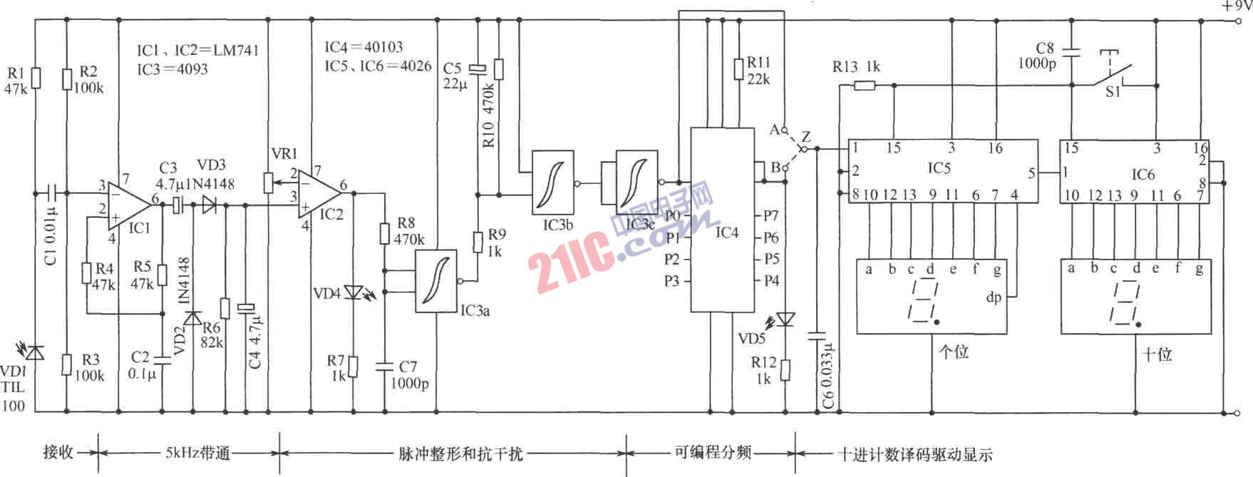 如圖所示的數(shù)字電路組成的計(jì)數(shù)器是采用紅外線作檢測信號,對活動目標(biāo)掃描計(jì)數(shù)的小裝置,很適用于生產(chǎn)線,對傳送帶上移動的物品進(jìn)行快速而準(zhǔn)確的計(jì)數(shù)。也可用于其他目的,例如對進(jìn)站口或出站口的乘客進(jìn)行計(jì)數(shù)等。該電路的特點(diǎn)是結(jié)構(gòu)簡單、制作容易、經(jīng)濟(jì)實(shí)用。還有一個最突出的優(yōu)點(diǎn)是,它可對遮光次數(shù)不同的任何物品都能直觀而準(zhǔn)確地計(jì)數(shù)。比如從一側(cè)看汽車就有前后兩組車輪被掃描,這就需要對掃描信號二分頻后再計(jì)數(shù),才能得出正確結(jié)果。該裝置由紅外發(fā)射和接收兩大部分組成。