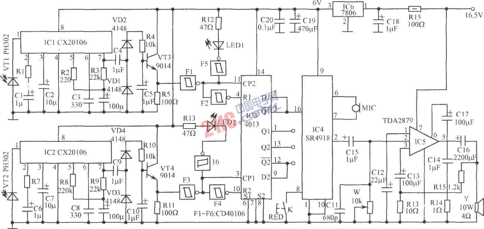 該電路采用紅外光作主動光源,如裝在大門口,在紅外線照射區(qū)域內(nèi),當(dāng)有人走過遮擋了紅外線時,能自動判斷人是走進(jìn)還是走出,進(jìn)而發(fā)出相應(yīng)的語音提醒,完成語言執(zhí)勤的任務(wù)。例如:有人進(jìn)入油庫重地,會提醒“嚴(yán)禁煙火”;進(jìn)入旅游區(qū),能勸告“愛護(hù)公物,注意衛(wèi)生”;進(jìn)入賓館、超級市場,則敬告“歡迎光臨”;當(dāng)來客離開時,可喊出“再見”。該電路適于需要語言服務(wù)的公共場所和特定區(qū)域。它由紅外發(fā)射電路和紅外接收電路組成。