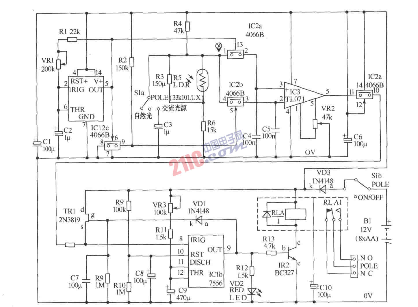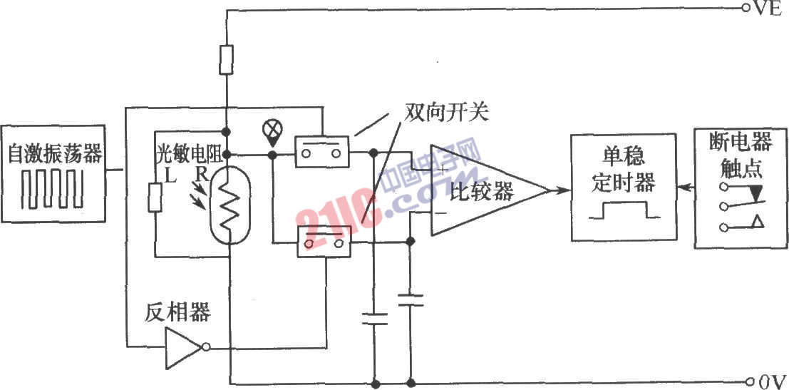 如圖為高靈敏度報(bào)警器電路的簡(jiǎn)化框圖,其中光敏電阻LDR與3個(gè)普通電阻相連接。這樣,當(dāng)光線從全暗到全亮之間變化時(shí),圖中X點(diǎn)的電位變化范圍約為電源電壓的1/4到3/4。此電位同時(shí)加在兩個(gè)雙觸點(diǎn)開(kāi)關(guān)的輸入端。一個(gè)自激振蕩器和一個(gè)反相器的組合電路控制這兩個(gè)開(kāi)關(guān)交替轉(zhuǎn)換,轉(zhuǎn)換頻率通常為幾赫,以使兩個(gè)電容交替充電。由于雙觸點(diǎn)開(kāi)關(guān)在“關(guān)”狀態(tài)時(shí)其電阻很大,而由運(yùn)放構(gòu)成的比較器其輸入阻抗亦極高。而電容上的電荷存儲(chǔ)在雙接點(diǎn)開(kāi)關(guān)和比較器之間的電容器極板上。因此開(kāi)關(guān)轉(zhuǎn)接時(shí),放電很少。這樣就構(gòu)成了一種取樣保持電路。當(dāng)電容上的電荷(電位)使比較器反相輸入端(-)電位升高到大于同相輸入端(+)的電位時(shí),或者同相輸入端電位低于反相輸入端電位時(shí),比較器的輸出變“低”,利用該低電平去觸發(fā)后接的單穩(wěn)定時(shí)器和繼電器工作。