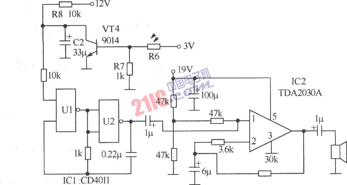 音頻警示器的制作:傳統(tǒng)的報警器是連續(xù)監(jiān)聽音頻,在無音頻時會發(fā)出連續(xù)的告警聲(缺點是說話間隔中的停頓或電視劇中正常的沉默場面被判定為無音頻而告警)。該警示器是針對音頻信號進(jìn)行采樣式檢測,在無音頻時僅發(fā)出短暫的告警聲。這種設(shè)計是認(rèn)真研究了聲音信號的特點而考慮的,從而避免了干擾和誤報警。該音頻警示器采用模糊判斷法,每隔6s對音頻持續(xù)檢測3s,間隔時間和檢測時間均可調(diào)。其工作過程是:如果檢測到有聲音,則音頻指示燈點亮,并保持6s(在這6s內(nèi)無論有無音頻均認(rèn)定為有音頻)。如果沒有檢測到音頻信號,則持續(xù)檢測3s,如有音頻則點亮指示燈并保持6s,3s內(nèi)仍無音頻則熄滅音頻指示燈并發(fā)出警示聲,警示聲是延續(xù)時間為0.5s左右的嘟聲,警示聲響后又保持6s(6s內(nèi)保持不檢測狀態(tài)),然后再次重復(fù)以上的檢測過程。電路如下圖所示。