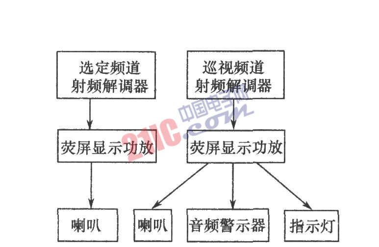 如圖所示為該系統(tǒng)的原理框圖。對于重要播出時段的重要節(jié)目的監(jiān)聽,采用選定的解調(diào)器,通過可顯示音頻有無的、界面親切的音頻功放機進(jìn)行監(jiān)視與監(jiān)聽,以保證能及時準(zhǔn)確發(fā)現(xiàn)故障并保證音頻的質(zhì)量;對于非重要節(jié)目的監(jiān)聽,采用自動轉(zhuǎn)換頻道(或頻率)的解調(diào)器+音頻指示燈+音頻警示器進(jìn)行監(jiān)視監(jiān)聽。由單片機組成程控器,編制程序。自動控制解調(diào)器(數(shù)顯收音機或電視機),使其每隔10s左右自動換臺。監(jiān)視者既可以根據(jù)熒屏顯示和相應(yīng)的聲音判斷撥出的質(zhì)量,也可以通過音頻警示器和音頻指示燈大致判斷音頻的有無。