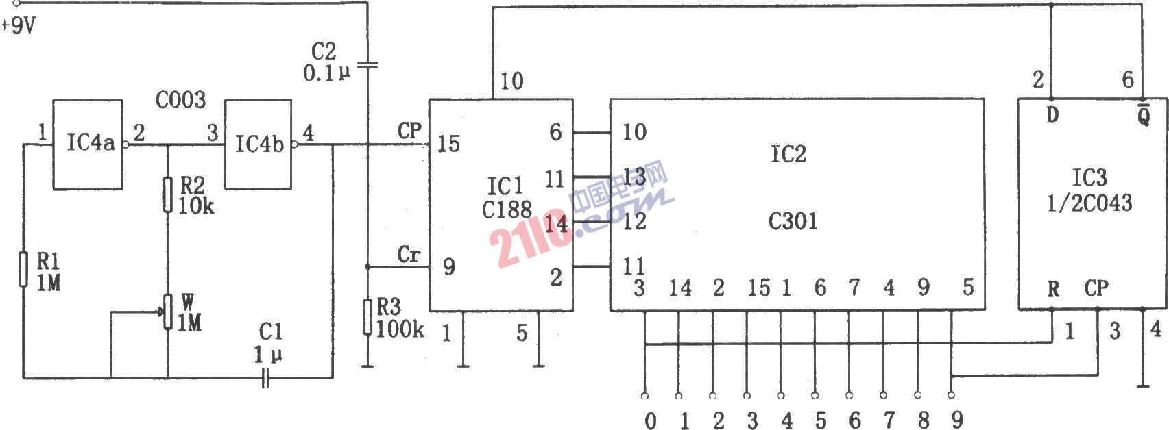電源電路接通時。微分電路C2、R3給IC1的Cr端(⑨腳)提供一個正向尖脈沖,使IC1清零,相應(yīng)譯碼器IC2(C301)的“0”端(③腳)輸出高電平,該高電平又加至IC3的R端(①腳),使其置0,相應(yīng)⑥腳為高電平,lC1⑩腳為高電平,使IC1作加法計數(shù)。當(dāng)C003向IC1送入一個計數(shù)脈沖時,IC1的QA~QD端(6、11、14、2腳)的BCD碼經(jīng)二-十進(jìn)制譯碼器IC2譯碼后,在其“0”~“9”十個輸出端(3、14、2、15、1、6、7、4、9、5腳)依次輸出高電平。若此十個輸出端通過接口電路與繼電器或可控硅相連,則可使繼電器或可控硅所掛彩燈從“0”~“9”依次點亮。