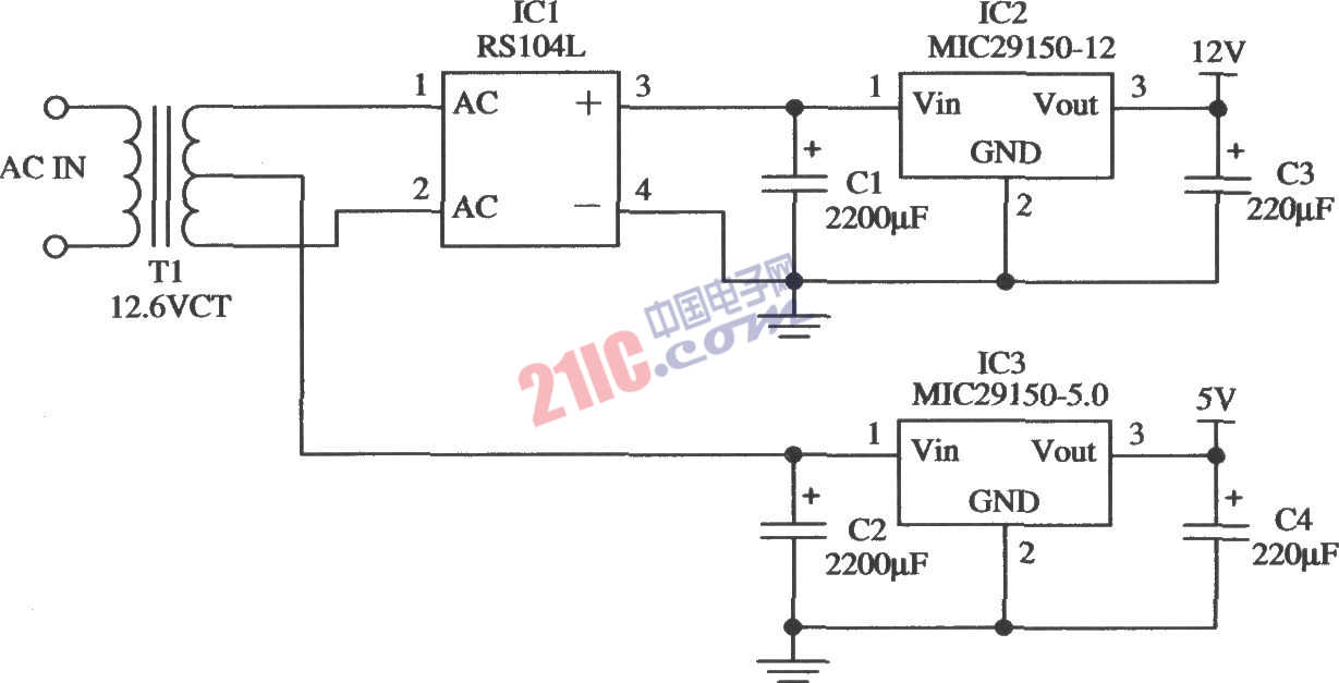 如圖所示的是由兩片Micrel公司生產(chǎn)的MIC29150-12和MIC29150-5.0穩(wěn)壓器構(gòu)成的低成本的雙路輸出的穩(wěn)壓器電路。