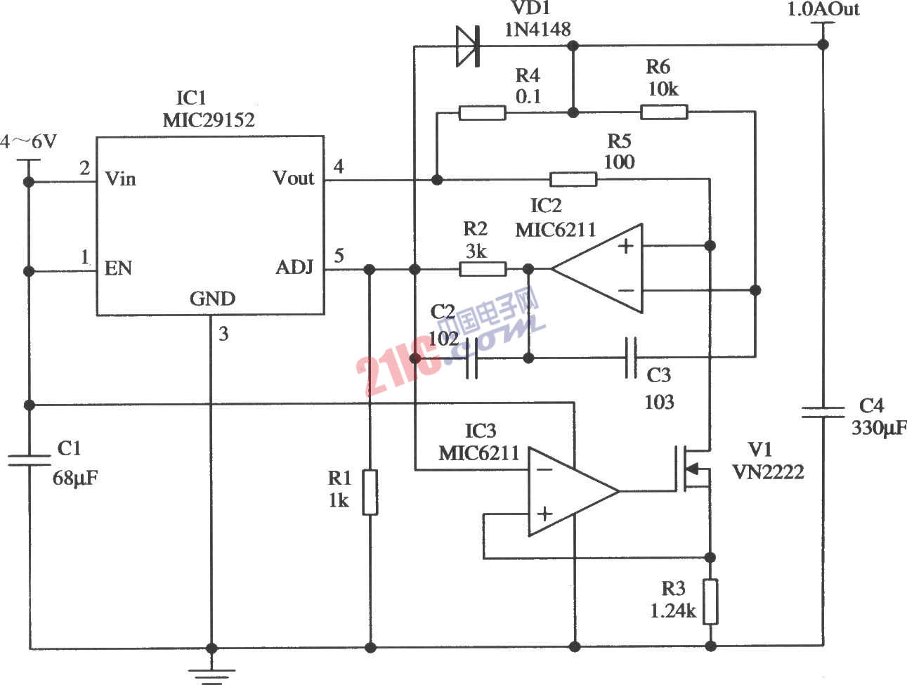 如圖所示的電路是采用MIC29152和一只雙運放及其他元件構(gòu)成的輸出電流為1.0 A的恒流源電路。這種恒流源電路對Micrel公司的所有輸出可調(diào)的穩(wěn)壓器均適合。