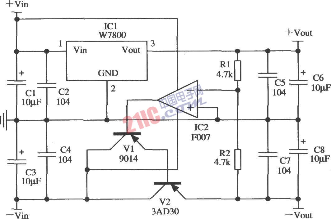 如圖所示是用W7800正集成穩(wěn)壓器和F007運算放大器組成的跟蹤式穩(wěn)壓電源的應(yīng)用電路。在有些使用正、負(fù)電源的場合,需用負(fù)電源跟蹤正電源的變化。圖中用W7800 做正電源,用運算放大器和功率管組成可跟蹤的負(fù)電源。圖中用兩只完全相同(精度要高)的4.7 kΩ電阻,將F007的輸入端電位控制在零電平,而用F007的輸出端去控制負(fù)電源回路中的調(diào)整管,以保持負(fù)輸出對正輸出的跟蹤。F007運放的電源采用正、負(fù)的輸入電壓源。