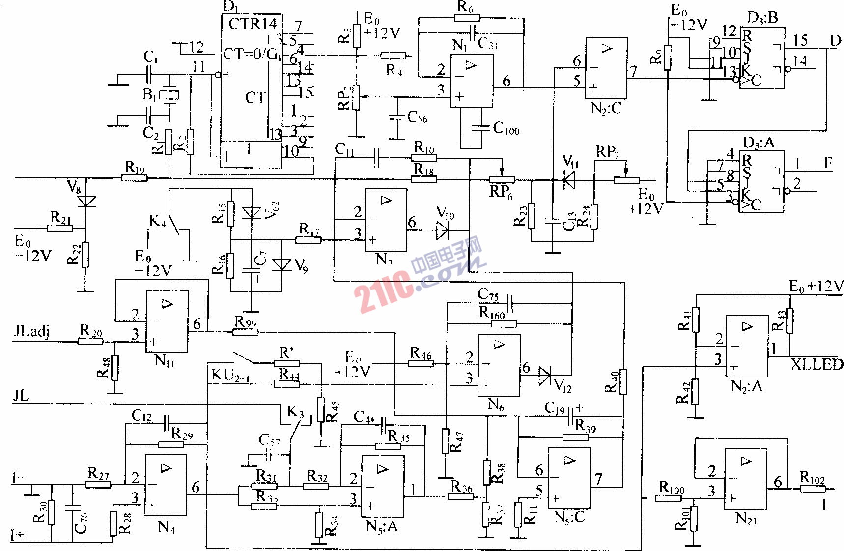 輸出電壓的穩(wěn)定,主要是利用負(fù)反饋原理,將輸出電壓的取樣值反饋到誤差比較器,由誤差比較器輸出的誤差電壓控制或調(diào)制(調(diào)節(jié))脈寬調(diào)制器的輸出脈沖寬度從而調(diào)節(jié)輸出電壓的高低,實(shí)現(xiàn)穩(wěn)壓輸出的目的。如圖,取樣電壓LOAD(-)經(jīng)電阻R19,送到誤差比較器N3的“-”端,N3的“+”端通過電阻R17接到由-12V電源和穩(wěn)壓二極管V9提供的-4.3V基準(zhǔn)電壓,正常工作時(shí)K4接點(diǎn)倒向-12V。N3實(shí)際是一個(gè)差值放大器,它將兩輸入端輸入電壓的差值進(jìn)行放大輸出,因?yàn)榛鶞?zhǔn)電壓是不變的,所以若取樣電壓升高(負(fù)電壓增大),它與基準(zhǔn)電壓相減后的負(fù)電壓增大,反相放大后,輸出的誤差電壓(正值)增大,反之若取樣電壓降低(負(fù)電壓減小),它與基準(zhǔn)電壓相減后的負(fù)電壓降低,反相放大后,輸出的誤差電壓(正值)降低。而取樣電壓的高低,反映的正是輸出電壓的高低。由此不難看出其穩(wěn)壓調(diào)節(jié)過程:輸出電壓增大一取樣電壓增大→誤差電壓增大→脈寬調(diào)制器輸出脈沖寬度減小→輸出電壓下降。反之亦然,輸出電壓減小→取樣電壓減小→誤差比較器輸出誤差電壓減小→脈寬調(diào)制器輸出脈沖寬度增大輸出電壓上升,這種電壓負(fù)反饋通過脈寬調(diào)制器調(diào)節(jié)脈沖寬度,從而調(diào)節(jié)穩(wěn)定輸出電壓的功能正是PWM高頻開關(guān)電源的基本工作原理。電位器RP7和電阻R24分壓后通過二極管V11送到N2:A“-”端的電壓,主要用以控制脈寬調(diào)制器輸出脈沖的最大占空比,特別是在剛開機(jī),誤差比較器N3尚未正常工作時(shí)可防止N2:A輸出脈沖過寬。