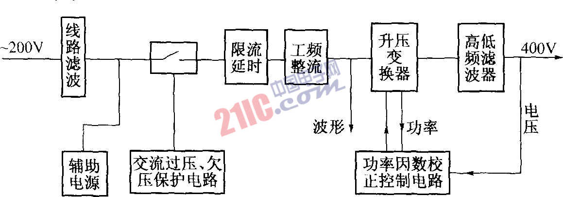如圖所示,(a)為補(bǔ)償電路,(b)為輔助電源。它主要由N1,功率因數(shù)校正控制模塊和一些配套電路所組成。N1內(nèi)部由一個(gè)鋸齒波發(fā)生器、脈寬調(diào)制器及多種比較器電路等構(gòu)成,鋸齒波發(fā)生器通過(guò)外接電容、電阻決定其工作頻率。本機(jī)使其輸出脈沖的頻率工作在50kHz,而輸出脈沖的寬度則由綜合比較處理后的誤差電壓來(lái)決定。它有3個(gè)取樣比較電路。輸出電壓取樣由輸出端的R19和R20的分壓值經(jīng)R16送到N1的11腳,經(jīng)V1送到N1的7腳;功率和電流波形取樣,從串聯(lián)在開(kāi)關(guān)回路中的小電阻R18上取得,經(jīng)過(guò)電阻、電容網(wǎng)路分別送到N1的2、3、4、5腳;基準(zhǔn)100Hz脈動(dòng)電壓波形由橋式整流器的輸出端取得,經(jīng)電阻R14、R2、R6等,分別送到N1的6腳、8腳。N1的1腳接地,15腳接到工作電源十18V。N1將輸出電壓取樣信號(hào)與基準(zhǔn)電壓進(jìn)行比較,將電流波形與工頻整流的電壓波形進(jìn)行比較根據(jù)輸出功率(電流)的大小,綜合地確定輸出脈沖的寬度,以保證輸出直流電壓穩(wěn)定在400V,使工頻整流器的輸出電流,即電感L上的電流或電阻R18上的電流,其波形近似全波正弦。N1的16腳輸出經(jīng)脈寬調(diào)制后的50kHz的脈沖送到N2:A具有回差特性的比較器進(jìn)行整形,從N2:A的1腳輸出,經(jīng)R23送到V4、V5組成的互補(bǔ)射極跟隨器放大,經(jīng)R17、R16分壓后加到VMOS開(kāi)關(guān)管V6的柵極,驅(qū)動(dòng)其導(dǎo)通或截止。實(shí)際上V6是一個(gè)包含VMOS管、提升二極管和整流橋的集成芯片。 |