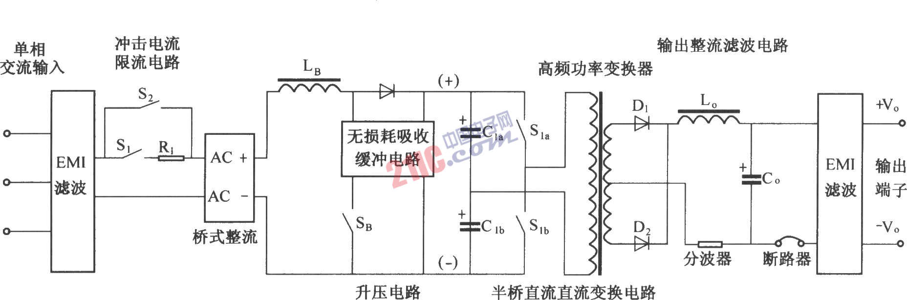 如圖所示為簡(jiǎn)化了的DMA12主電路原理圖。它主要由輸入電路及電磁干擾(EMI)濾波電路、沖擊電流限制電路、輸入整流濾波電路、升壓/功率因數(shù)校正電路及吸收回路、半橋功率變換電路、輸出整流濾波電路等幾部分組成。與DMA10比較,DMA12采用了單相輸入,升壓/功率因數(shù)校正方式和無(wú)損耗吸收緩沖電路,而半橋DC/DC功率變換及輸出整流濾波部分則與DMA10一樣。