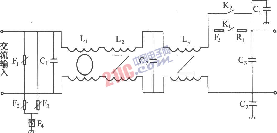 DMA12單相交流電壓經(jīng)由C3、L3和C1、L2、C2構(gòu)成的兩級差模濾波網(wǎng)絡(luò)和由與機(jī)殼相連的C4、C5和共模電感L1構(gòu)成的一級共模濾波網(wǎng)絡(luò),進(jìn)行EMI濾波,使EMI濾波后水平輸出符合VDE0871 A標(biāo)準(zhǔn)。