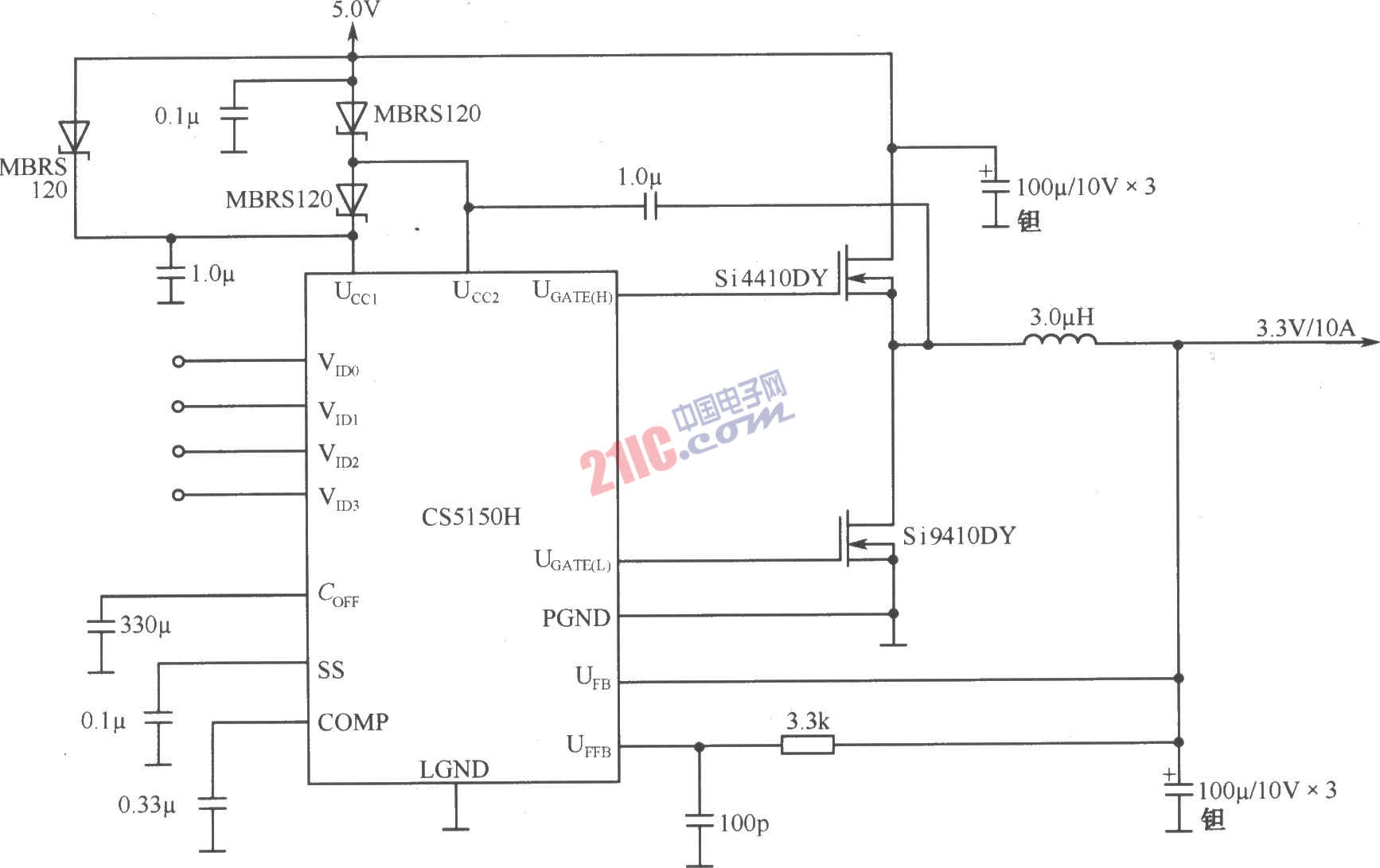 4位編碼同步降壓控制器CS5150H構(gòu)成的5.0V至3.3V/10A變換器
