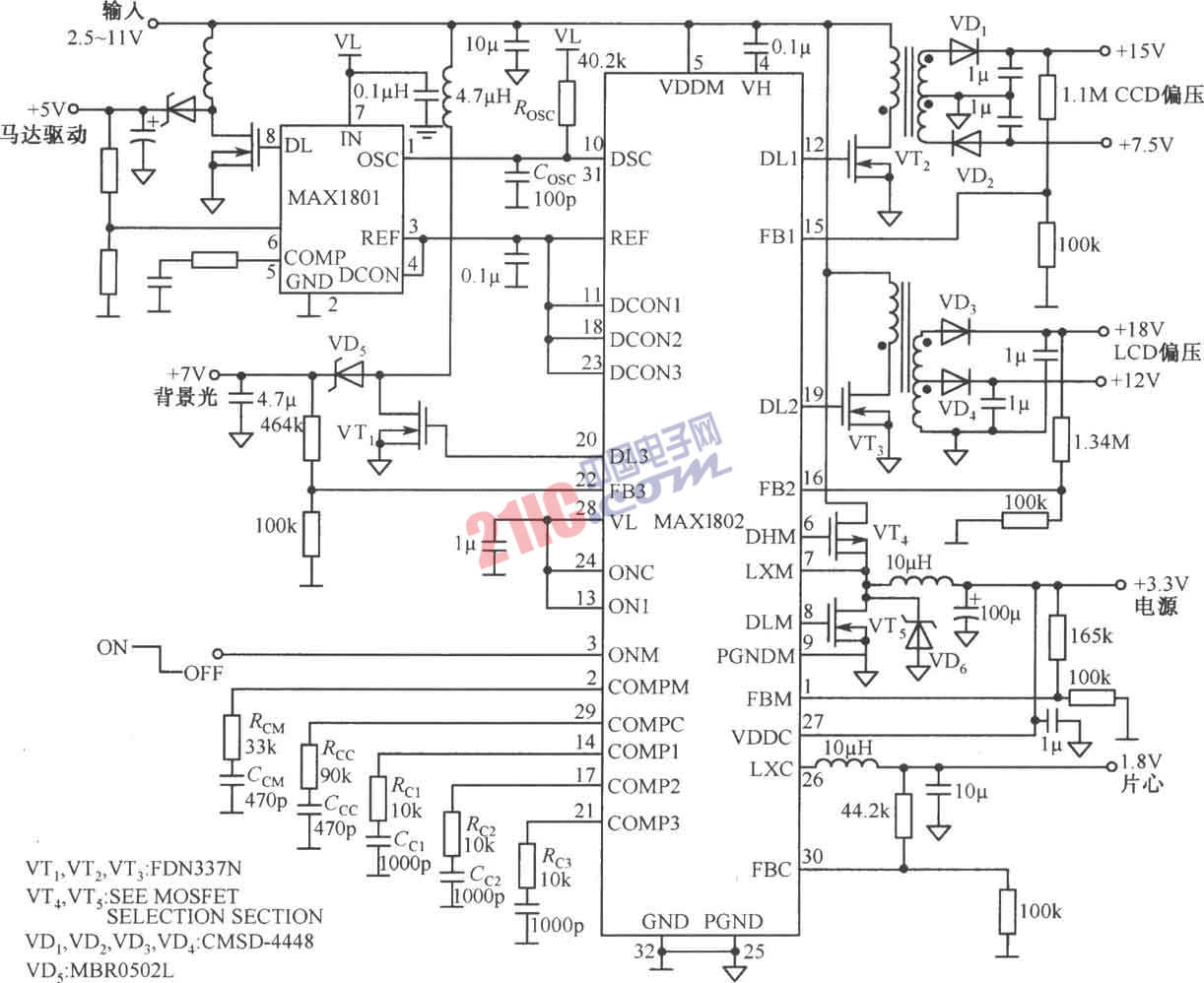 [導(dǎo)讀]由MAX1802構(gòu)成的多路輸出數(shù)碼相機電源電路如圖所示。MAX1802芯片有兩個降壓變換器和三個升壓變換器,輸入電壓范圍為2.5~11V,輸出電壓為2.7~5.5V連續(xù)可調(diào),最低輸出電壓可以調(diào)節(jié)到1.25V。MAX1802的工作頻率可達(dá)1MH