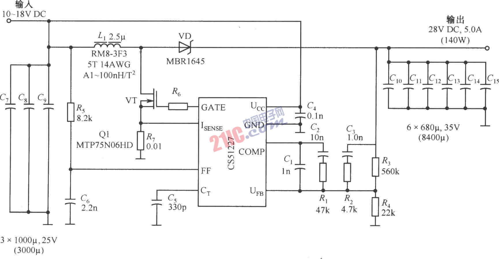 由CS51227構(gòu)成的輸出為28V/5A的直流穩(wěn)壓電源電路如圖所示。CS51227是一個電壓型PWM控制器,它的開關(guān)頻率可達l.0MHz,啟動電壓為4.7V,啟動電流為75μA。本電源輸入電壓為10~18V,輸出電壓為28V±1%,輸出電流為0~5A,開關(guān)頻率250kHz,輸出電壓紋波150mVp-p,效率90%。