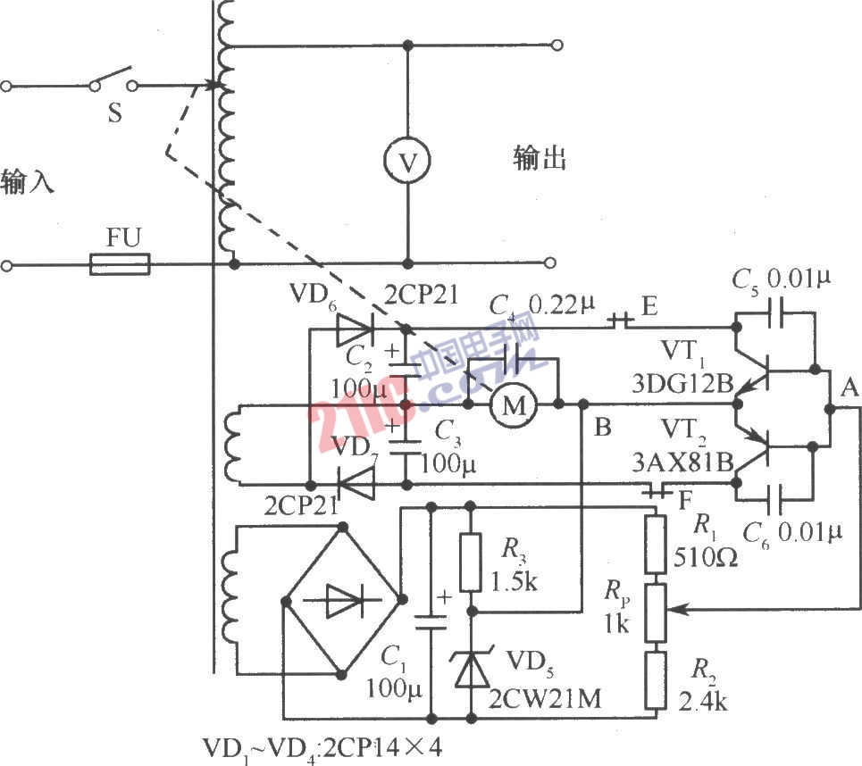 如圖為200W自動調(diào)壓式交流穩(wěn)壓電源電路圖。圖中用虛線框出的部分,它們的工作是緊密聯(lián)系的。當調(diào)壓變壓器輸出偏離220V時,其變壓器次級一個繞組取得這個誤差信號,送到VD1~VD4橋式整流,再經(jīng)Cl濾波后,變成直流電壓,再由R1、RP、R2組成的取樣電路取樣,調(diào)整RP,若A點電壓高于B點電壓(B點為VD5穩(wěn)壓的基準電壓),則放大部分的VT1導(dǎo)通(因為VT1為NPN管,集電極電壓為正),并放大,迫使電動機M轉(zhuǎn)動。電動機的轉(zhuǎn)動就帶動了調(diào)壓器的滑動臂移動。移動的方向是使輸出電壓降低。相反,若調(diào)整RP,A點電壓低于B點電壓時,則是放大部分的VT2導(dǎo)通(VT2為PNP管,集電極電壓為負),并放大,迫使電動機M向相反方向轉(zhuǎn)動,從而使調(diào)壓器的滑動臂向電壓升高的方向滑動。這就保證了調(diào)壓器輸出的穩(wěn)定。當然,當輸出電壓無誤差時,A點與B點等電位,兩只三極管都處于截止狀態(tài),電動機不動。 |