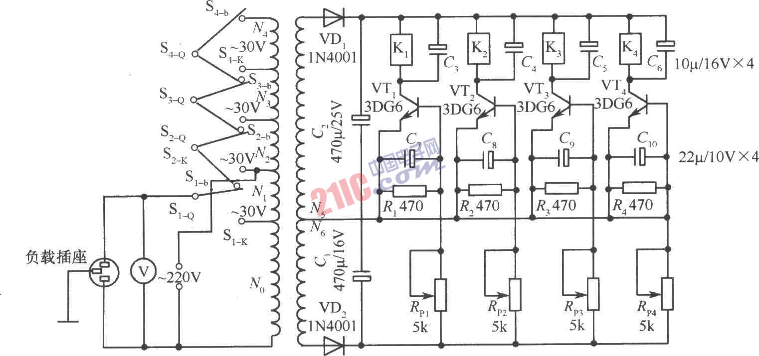 電路如圖所示。它由一只自耦變壓器和四級(jí)晶體管控制電路組成。當(dāng)電網(wǎng)電壓比較正常,為220V左右時(shí),第二級(jí)控制電路工作,晶體管VT2導(dǎo)通,驅(qū)動(dòng)繼電器K2吸合,輸出電壓與電網(wǎng)電壓相同,均為220V左右。當(dāng)電網(wǎng)電壓低于190V時(shí),由于次級(jí)電壓降低,迫使VT2截止,K2釋放,VT3導(dǎo)通,K3吸合,使輸出電壓提升了30V。依次類推,直到電網(wǎng)電壓低于130V時(shí),使次級(jí)電壓沒有能力使4個(gè)繼電器的任何一個(gè)動(dòng)作,輸出電壓提升了90V,輸出電壓為220V。當(dāng)電網(wǎng)電壓高于240V時(shí),VTl導(dǎo)通,Kl吸合,輸出降低30V。