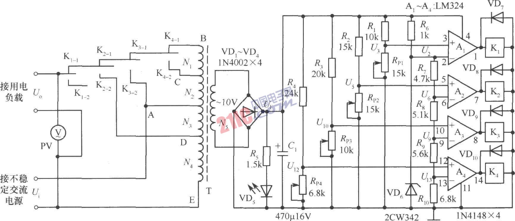 [導(dǎo)讀]如圖所示的全自動(dòng)交流調(diào)壓器可以把160~270V范圍內(nèi)變化的市電電壓Ui自動(dòng)、有效地控制在220±10%V以內(nèi)。 繼電器K1~K4和變壓器T視調(diào)壓源的負(fù)載而定。本節(jié)按100W用電負(fù)荷設(shè)計(jì)、選型,能滿足一般家用電器使用。K1~K4選