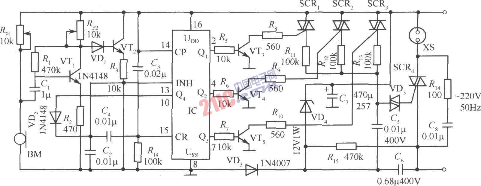 VT1~VT2選用9014高增益三極管;VT3~VT5選用3DG12三極管;BM可選用CN15E或阻抗為1kΩ的其他駐極體傳聲器;SCRl~SCR3為1A600V可控硅;SCR4選用電流大一些的可控硅,如10A600V。這樣,電器在2000W以下均能工作,但應加裝良好的散熱器;VD5可選用DB3型或2CTS雙向觸發(fā)二極管;IC選用CD4017;其余元器件按圖中標注選用。
