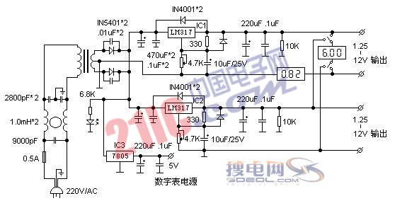 電源變壓器采用帶靜電屏蔽層外殼全封閉的優(yōu)質(zhì)變壓器。防止出現(xiàn)所謂的“交流聲”。整流電路并聯(lián)電容也可進(jìn)一步防止交流干擾。主調(diào)節(jié)電路由大家很熟悉的LM317T(IC1,IC2)構(gòu)成。它的寬范圍調(diào)節(jié)性能、完善的保護(hù)功能、簡潔的外圍電路、優(yōu)良的穩(wěn)壓性能足以勝任一般的業(yè)余電子制作實(shí)驗(yàn)需要。為方便輸出電壓調(diào)節(jié)及保證調(diào)節(jié)精度,在選擇R1和R2時(shí)應(yīng)注意選擇質(zhì)量好的4.7K的線性電位器。