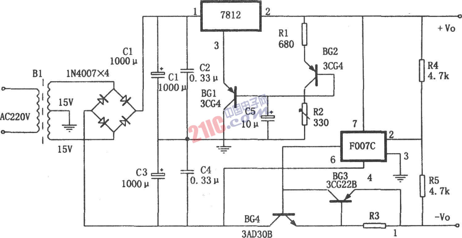 如圖所示是一種帶有溫度補償的、負(fù)電壓跟隨正電壓變化的正負(fù)對稱集成穩(wěn)壓電源。本電路特點是:在三端穩(wěn)壓器調(diào)壓回路中接有兩只同型號三極管,利用三極管PN結(jié)的溫度特性進行溫度的相互補償,從而使本電源輸出正電壓具有較高的溫度穩(wěn)定性和準(zhǔn)確性。利用運放F007C和調(diào)整管BG4(3AD30B),使負(fù)電壓準(zhǔn)確跟蹤正電壓的變化,從而使正負(fù)輸出電壓嚴(yán)格對稱,并且具有較高的精度。本電源適用于對正負(fù)電壓的對稱性要求較高的電子線路。