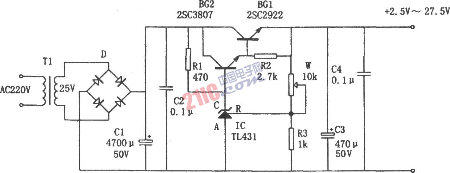 [導(dǎo)讀]如圖所示為一實用的高精度可調(diào)電源電路。該電路以具有溫度補償特性的、高精度的標(biāo)準(zhǔn)電壓源集成電路TL431為核心,配合復(fù)合調(diào)整管BG1、BG2等元件構(gòu)成穩(wěn)壓電源,輸出電壓在2.5~27.5V之間連續(xù)可調(diào),輸出電流≥5A,電壓紋